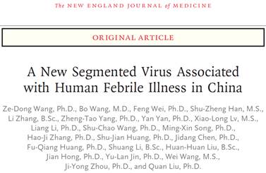 近日,由佛山科学技术学院刘全教授课题组与Bwin必赢网址宋铭忻教授等团队合作,在国际顶级医学领域学术期刊《The NewEngland Journal of Medicine,NEJM》(新英格兰医学杂志,IF=79.26,中科院一区Top期刊)在线发表题为“A New Segmented VirusAssociated with Human Febrile Illness in China”的研究论文,这是首篇今年由中国兽医团队发表的NEJM原创文章(Original Article),也是公司科研人员在该期刊首次发表论文。《新英格兰医学杂志》在包括《柳叶刀,TheLancet》、《美国医学会杂志,JAMA》和《英国医学杂志,BMJ》在内的四大权威医学期刊中全球排名第一,在世界各类著名科技杂志中其影响因子仅次于《癌症临床医生杂志(CACancer J Clin),IF= 187.04》。