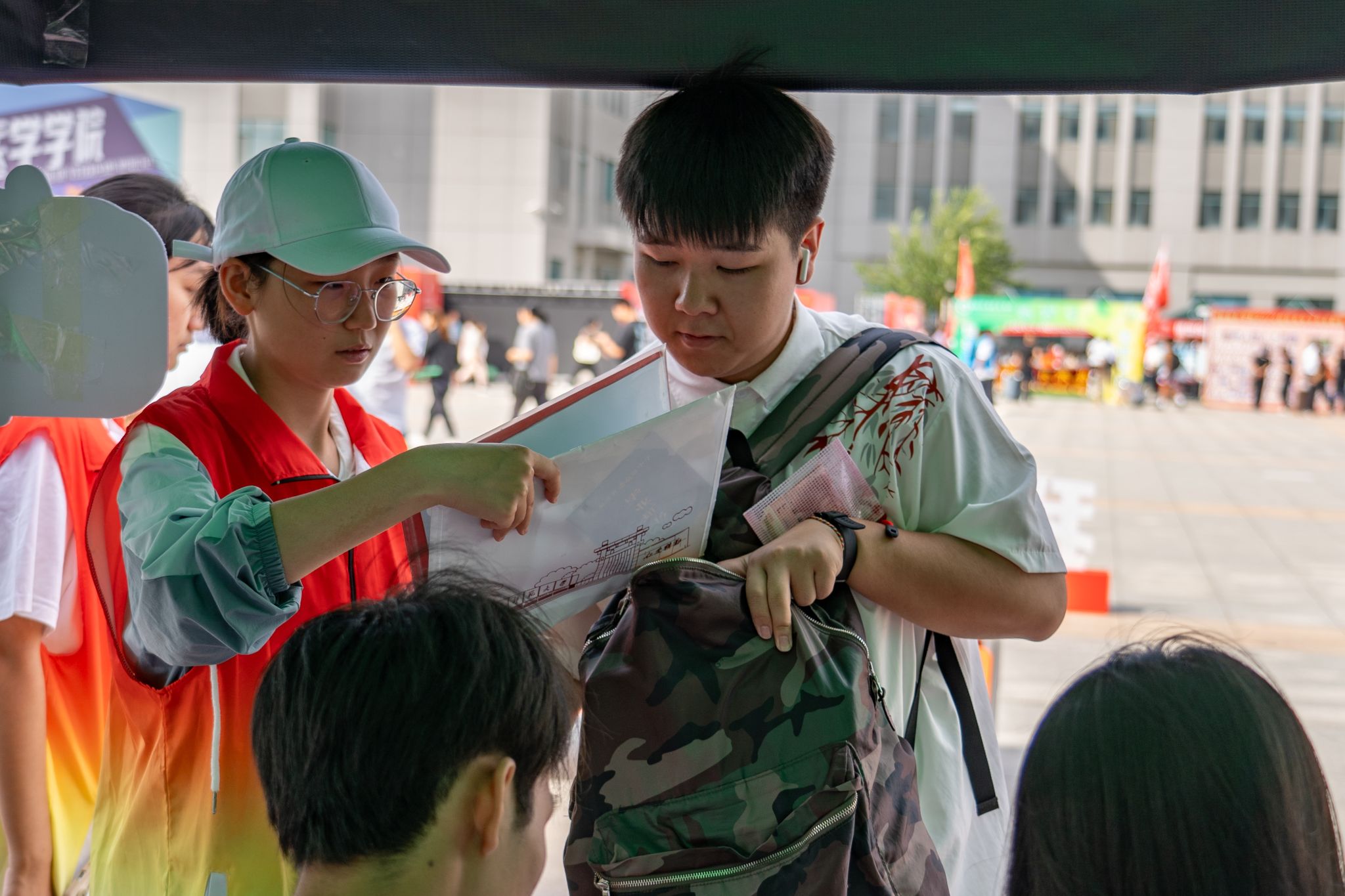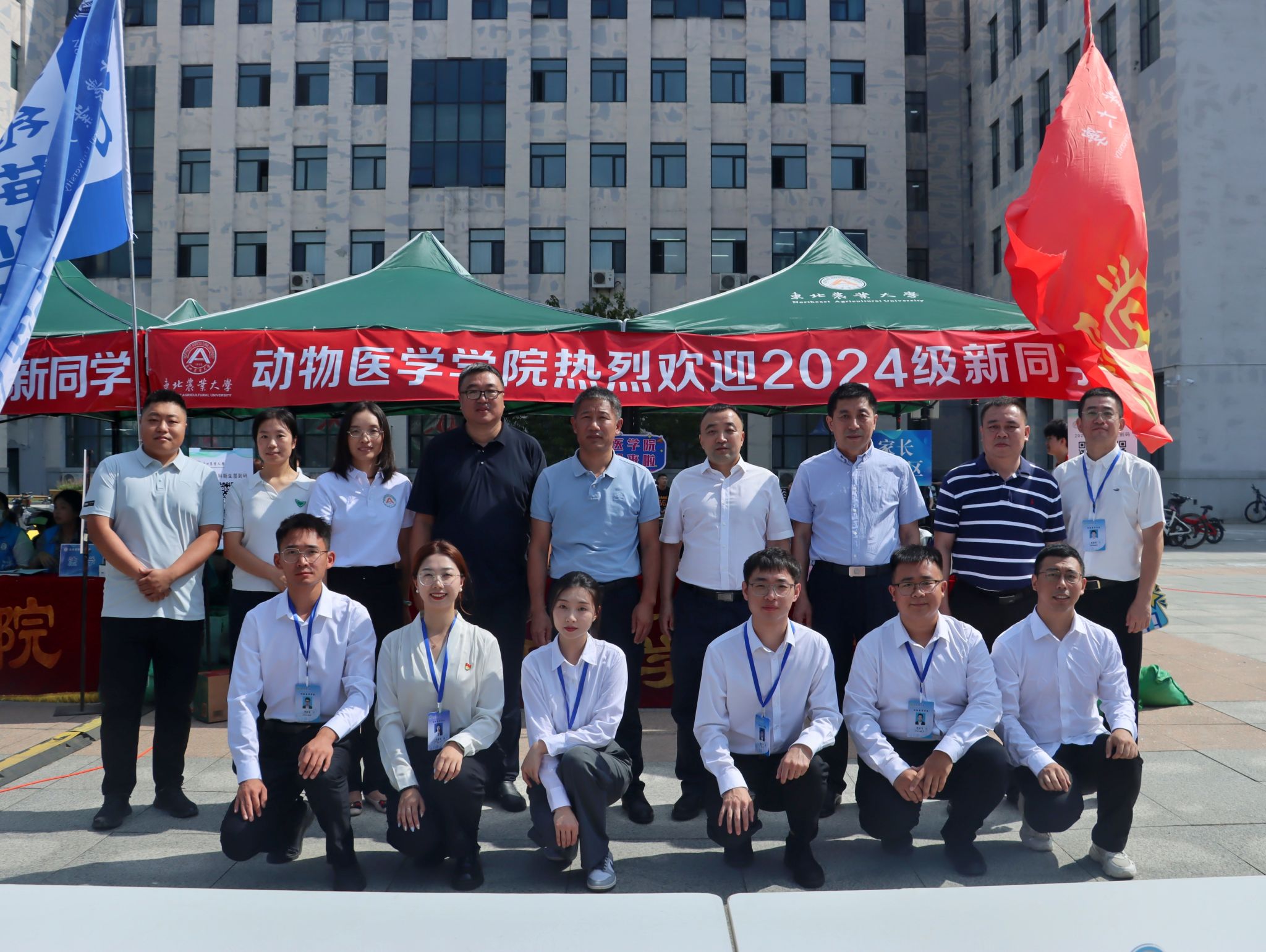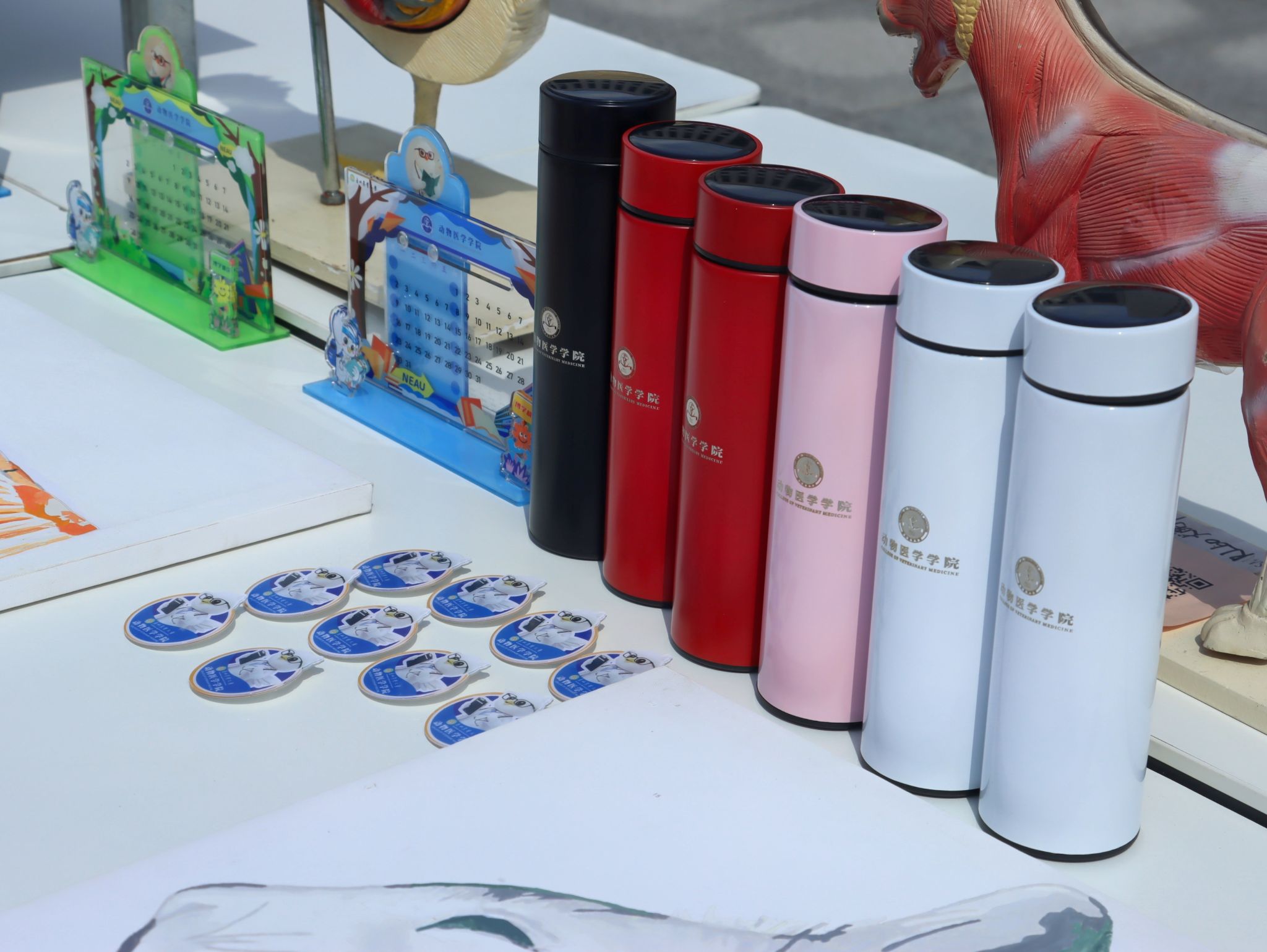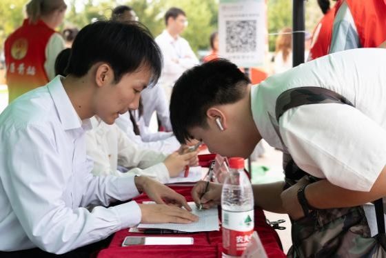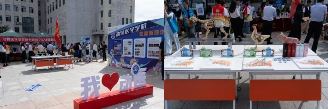 迎新场地划分为三个主要区域:签到区、志愿者服务区及家长休息区。签到区特别设置了迎新宣传展板,并以学院吉祥物“安安”为灵感,设计了拍照打卡点。另外设置看台展示了特色动物、动物模型以及动物手绘解剖图等。同时为每位新成员准备了彰显学院特色的精美文创礼品。志愿者们为新生提供了全方位的迎新服务,从新生抵达校园、办理签到手续,再到搬运行李,努力将迎新服务做到最好。学院还为新生及家长们准备了饮用水、食物、雨衣等必需品,将温暖迎新理念付诸实践,使新生能够迅速融入动医学院大家庭。