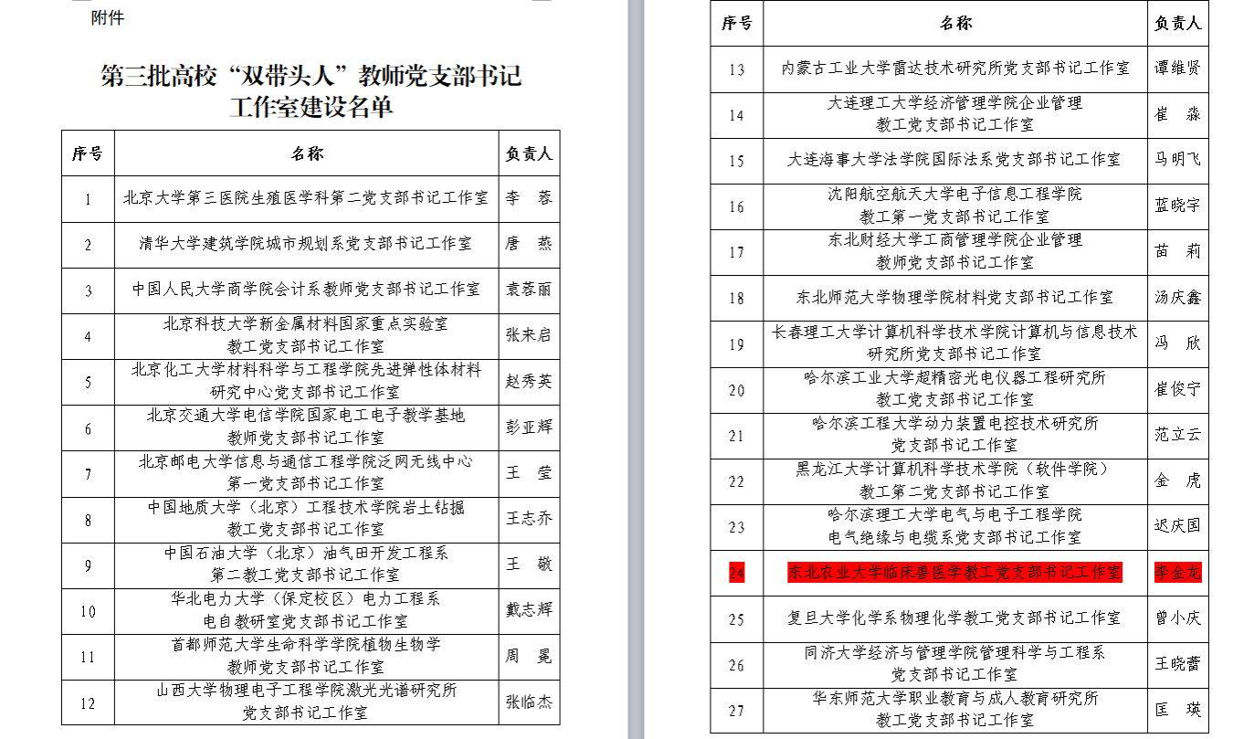 6月12日,教育部办公厅公布了第三批高校“双带头人”教师党支部书记工作室建设名单,经省级党委教育工作部门把关推荐、专家评审、教育部党的建设和全面从严治党工作领导小组成员单位集中审议、结果公示,遴选产生100个第三批高校“双带头人”教师党支部书记工作室,公司临床兽医学教工党支部书记工作室入选名单。